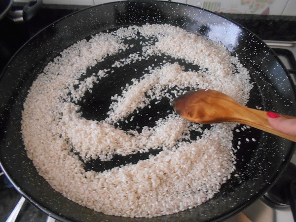 En una paella o caldero (quien tenga) sofreimos el arroz con un poco de aceite (costumbres alicantinas)