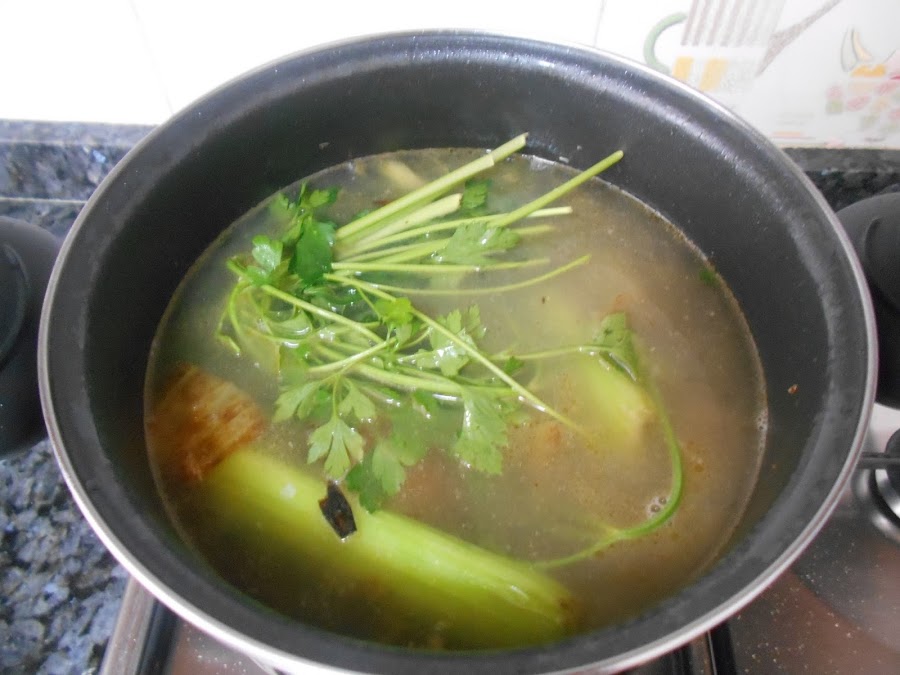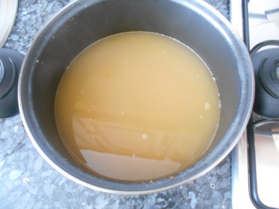 1l Caldo de pescado (morralla, bacalao, mujol, gallineta, merluza, salmonetes, cebolla, zanahoria, apio, laurel, perejil, sal y 2 litros de agua...)