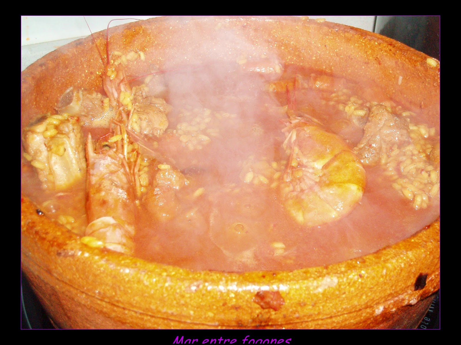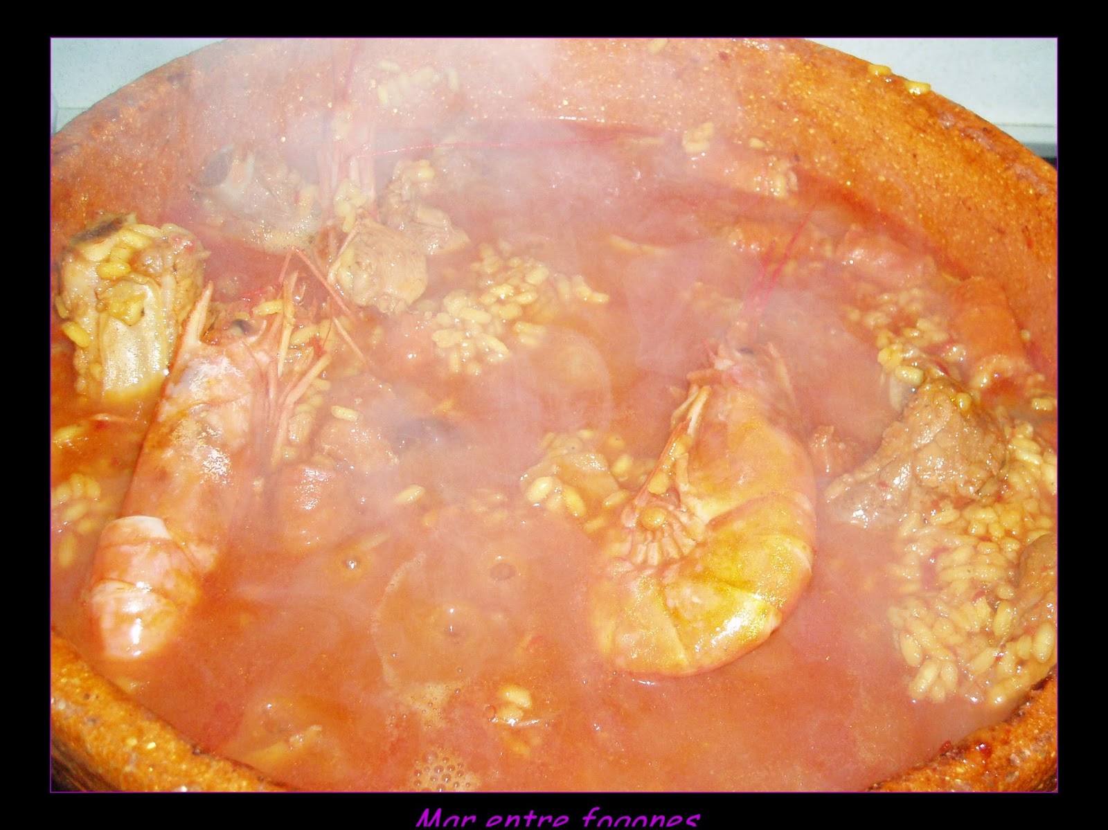 A media cocción del arroz ponemos los gambones ya que en 5 minutos están cocinados.