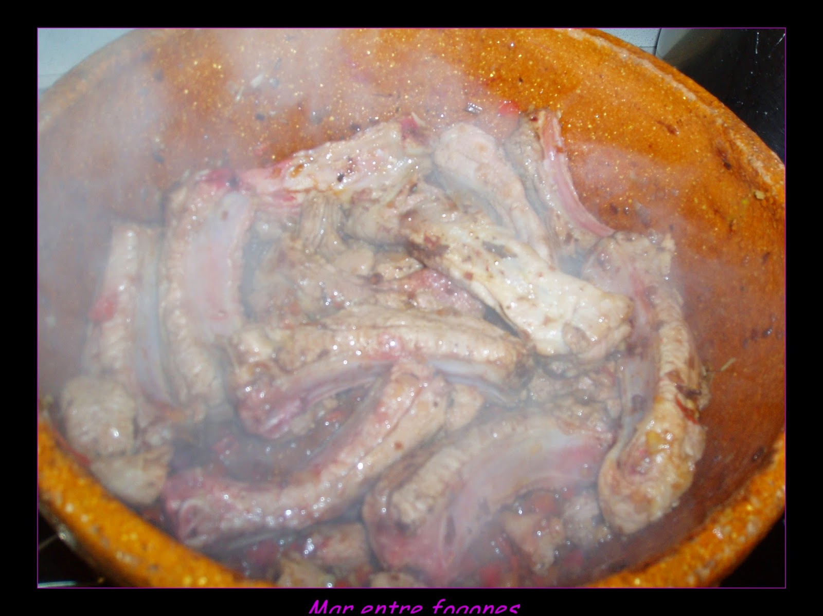 Partimos las costillas en tiras y el pavo en trocitos no muy grandes.
