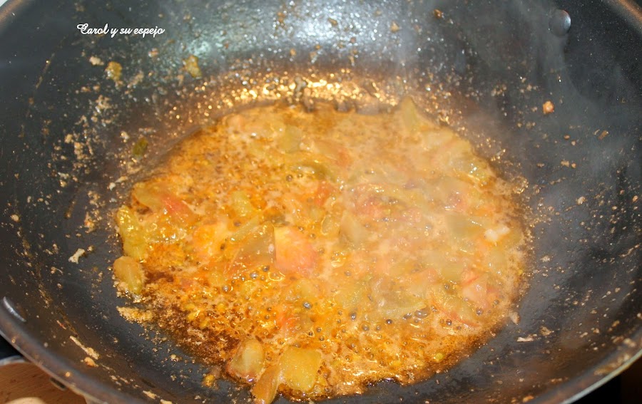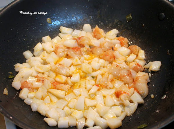 - Cuando esté bien rehogado el marisco, lo sacamos y sofreimos un tomate a trocitos, éste debe estar bien sofrito, esto nos dará mejor sabor al arroz.