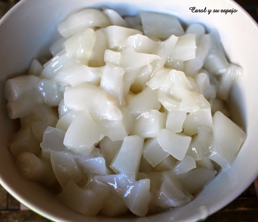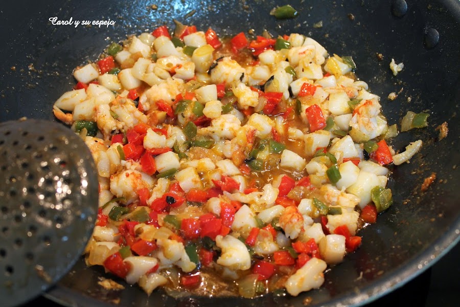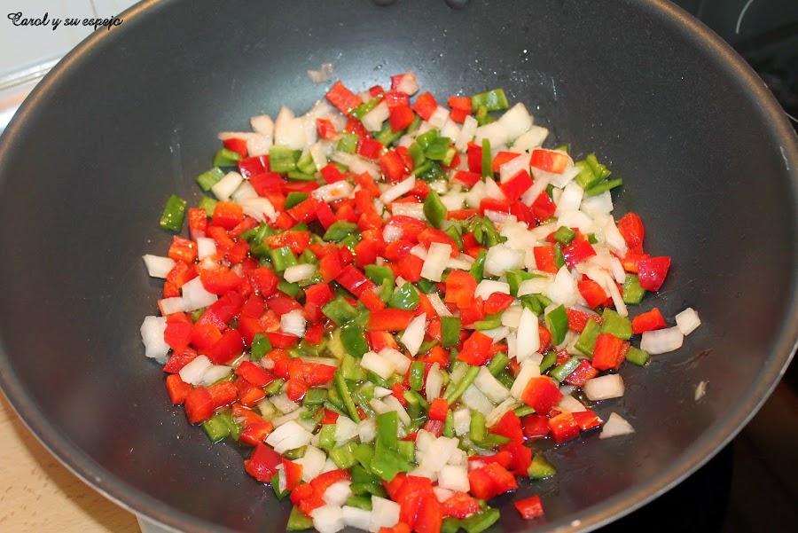 - Primero picamos muy finamente, el pimiento rojo, verde, media cebolla y la sepia y los gambones .