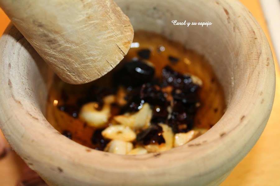 - En una sartén pequeña, con un poco de aceite, sofreimos tres dientes de ajo y una ñora a trocitos . Cuando estén los ajos doraditos lo pasamos todo a un mortero y lo majamos.