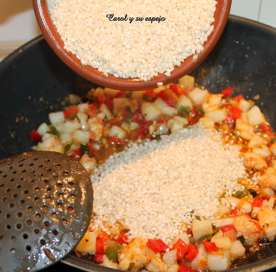 - Removemos bien, añadimos el arroz, el majado de ñora y al azafrán y rehogamos un poco.