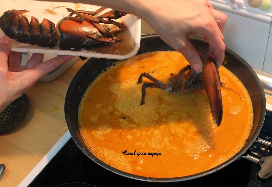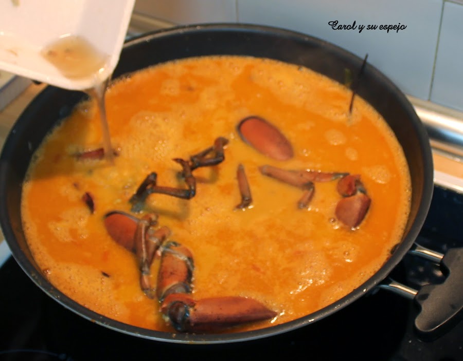 - Ahora ya está listo para añadir el caldo de pescado, que habiamos hecho anteriormente. Dejamos que empiece a hervir y añadimos los bogavantes que están cortados a la mitad. Los mátó el pescadero, yo sería incapaz!!! . Los pusieron en un bol para que no se perdieran los jugos que suelta el bogavante y luego se lo añadí al arroz.