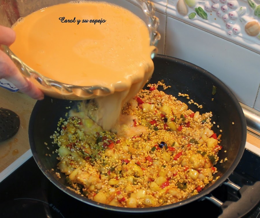 - Volvemos a añadir a la sartén, todo lo pochado anteriormente