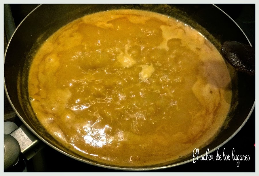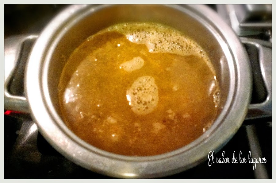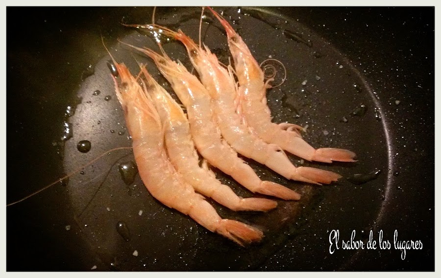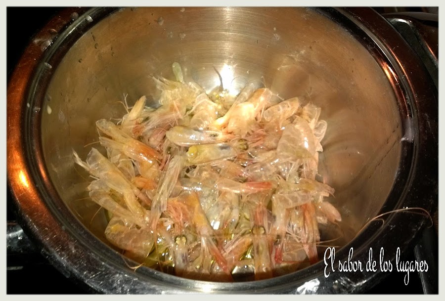 Pela las gambas (reserva algunas sin pelar para adornar los platos). Sofríe en una cazuela las pieles y cabezas de las gambas unos 7 minutos, machacando las cabezas para que suelten el jugo. Una vez fritas, cubre con 1 litro de agua aproximadamente y cuece 10 minutos. Cuela el caldo y reserva.