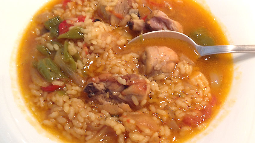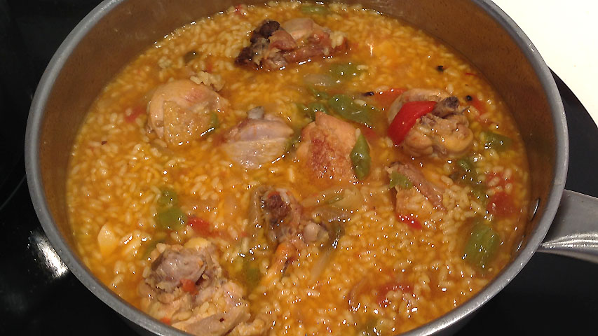 Cocido el pollo incorpora el arroz y cubre de nuevo con caldo. El arroz que yo uso tarda en cocer 15 minutos. Ve añadiendo caldo caliente para que el arroz no se seque y esté caldoso a tu gusto.