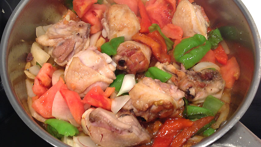 Tras dorar el pollo añado la verdura troceada: ajo, cebolla, pimiento verde y pimiento rojo. Añado un clavo, pimienta en grano (al gusto) y un poco de azafrán.