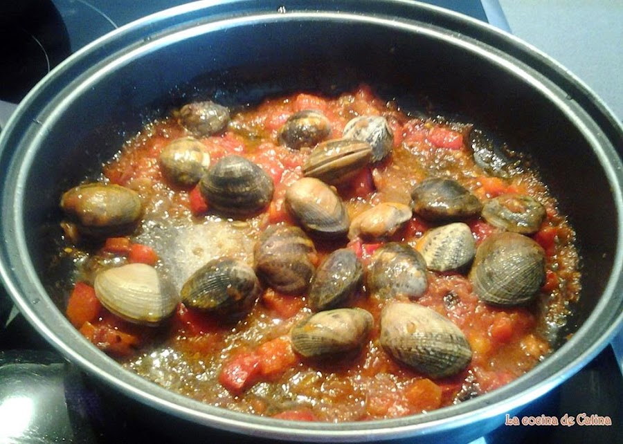 A continuación echamos las almejas, removemos bien y las vamos sacando conforme se vayan abriendo y las reservamos.