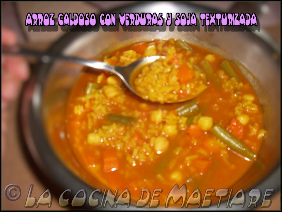 Añadimos el arroz, removemos y tapamos y seguimos cocinando a fuego medio-bajo tapado . A los 2 minutos de añadir el arroz añadimos la soja texturizada fina y seguimos cocinando tapado removiendo de vez en cuando hasta que el arroz esté cocido ( pero no pasado ).