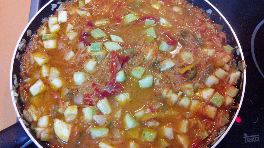 Cuando estén un poco hechos añadimos la zanahoria rallada, el calabacín a daditos, los pimientos picados, sal y dejamos rehogar unos 10 minutos a fuego medio.