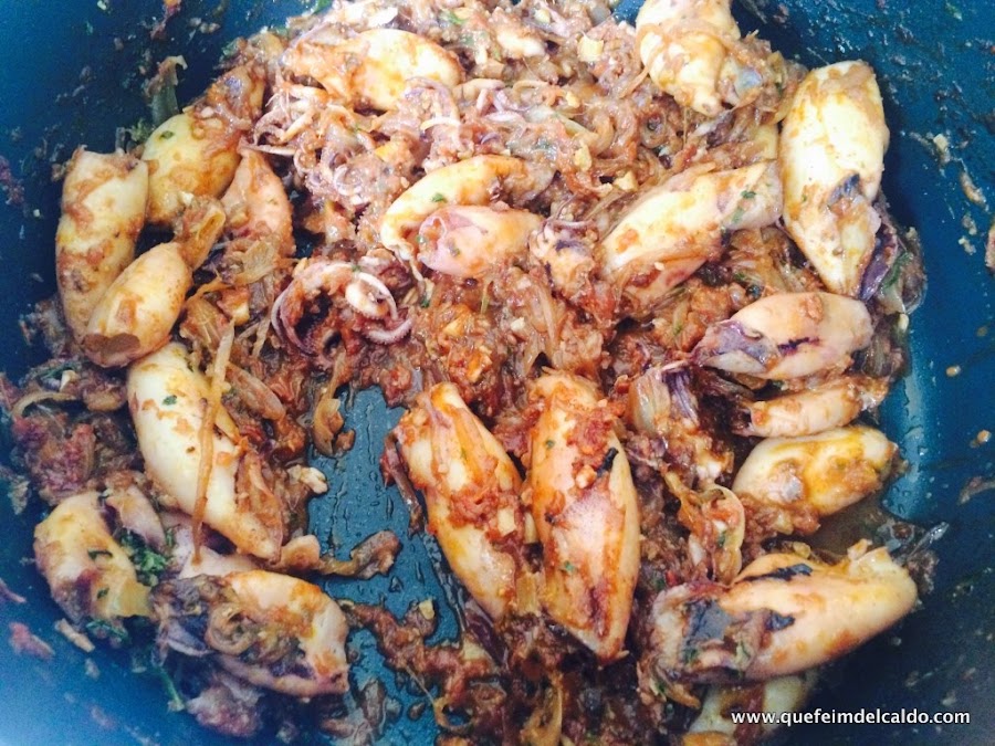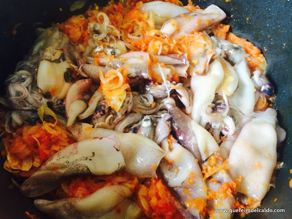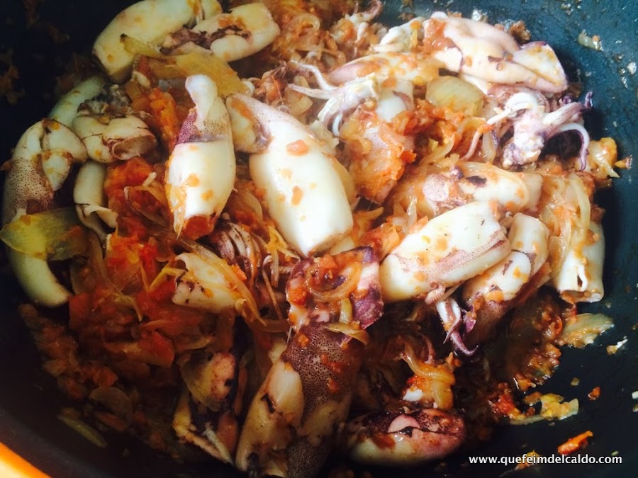 Añadimos al sofrito los chipirones, yo los he puesto enteros ya que son muy pequeños.