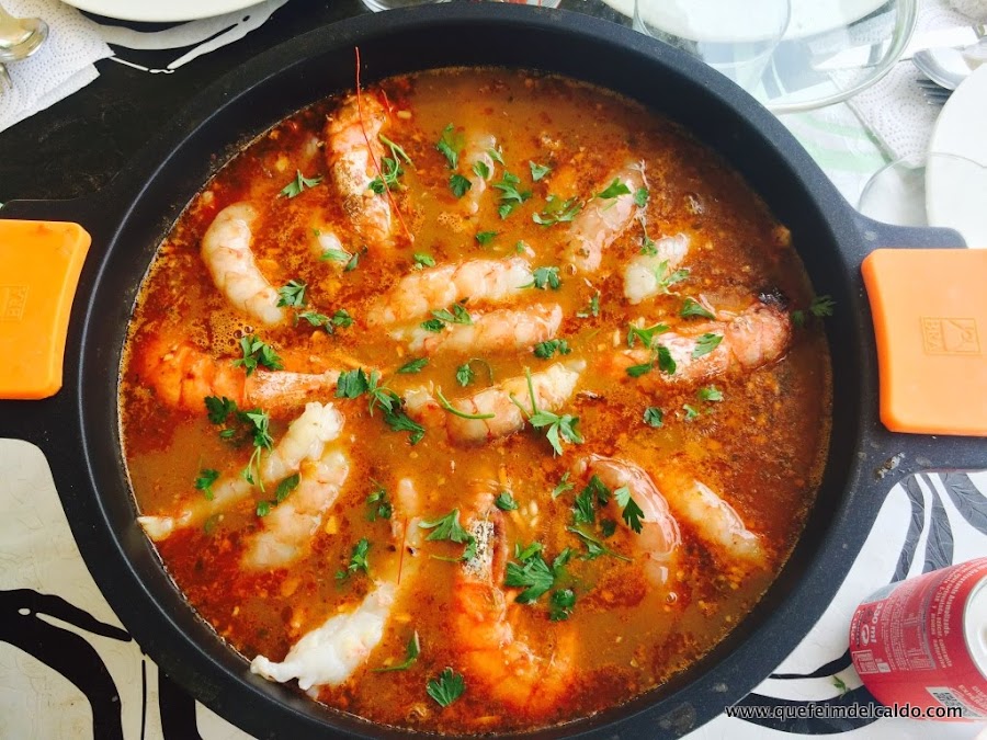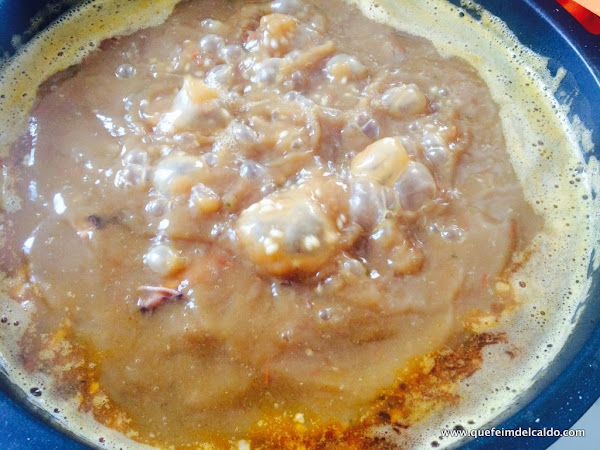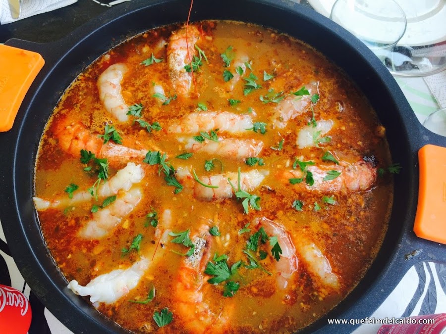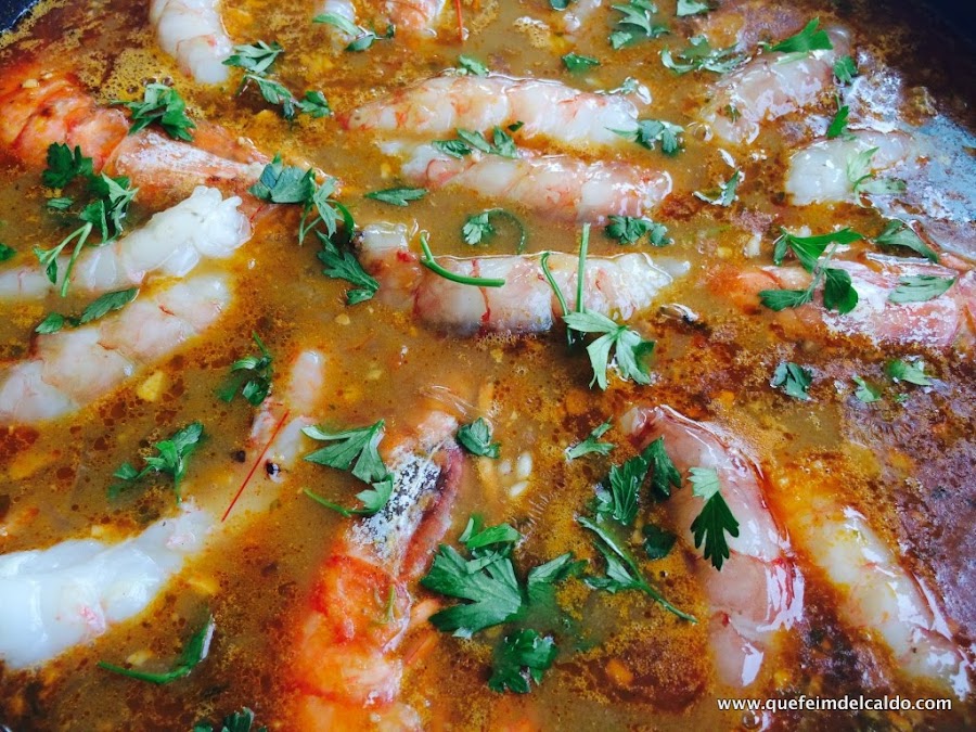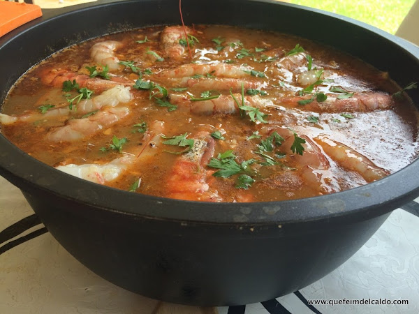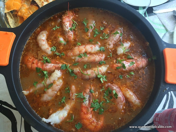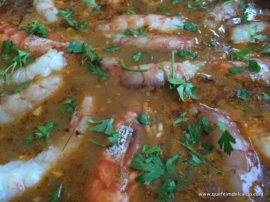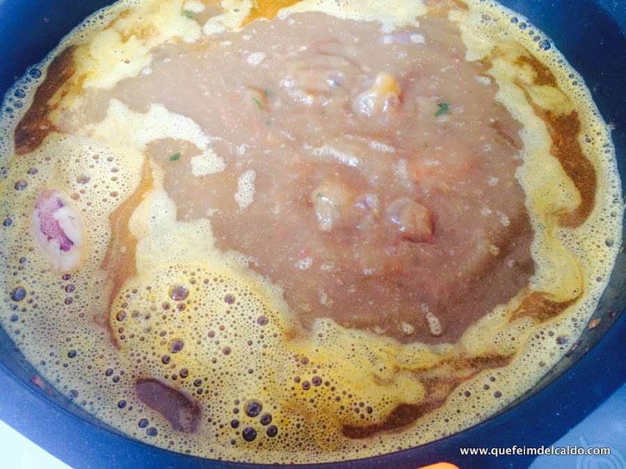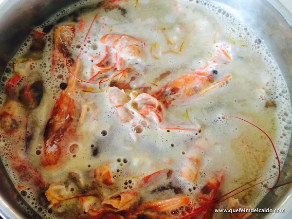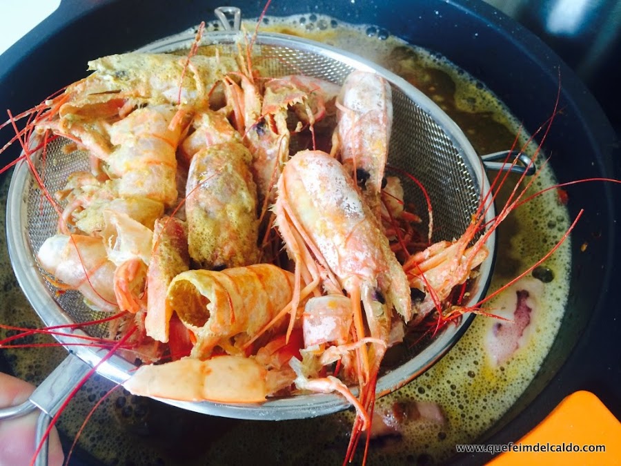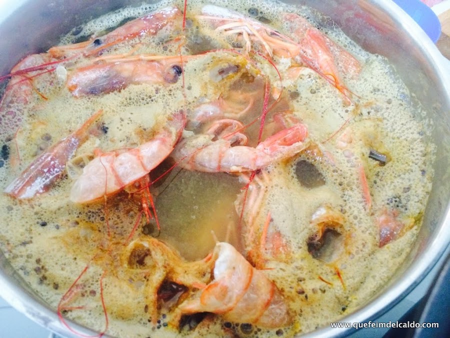 Incorporamos los 3 l. de caldo a la cazuela, lo colamos para evitar las cascaras de los gambones.