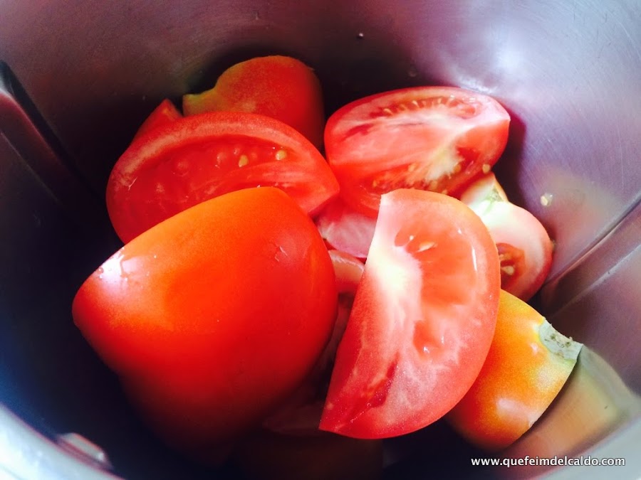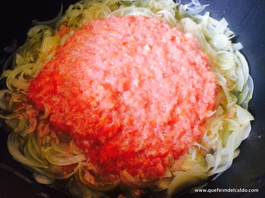 Transcurrido el tiempo que hemos dedicado al sofrito de la cebolla incorporamos los 3 tomates triturado.
