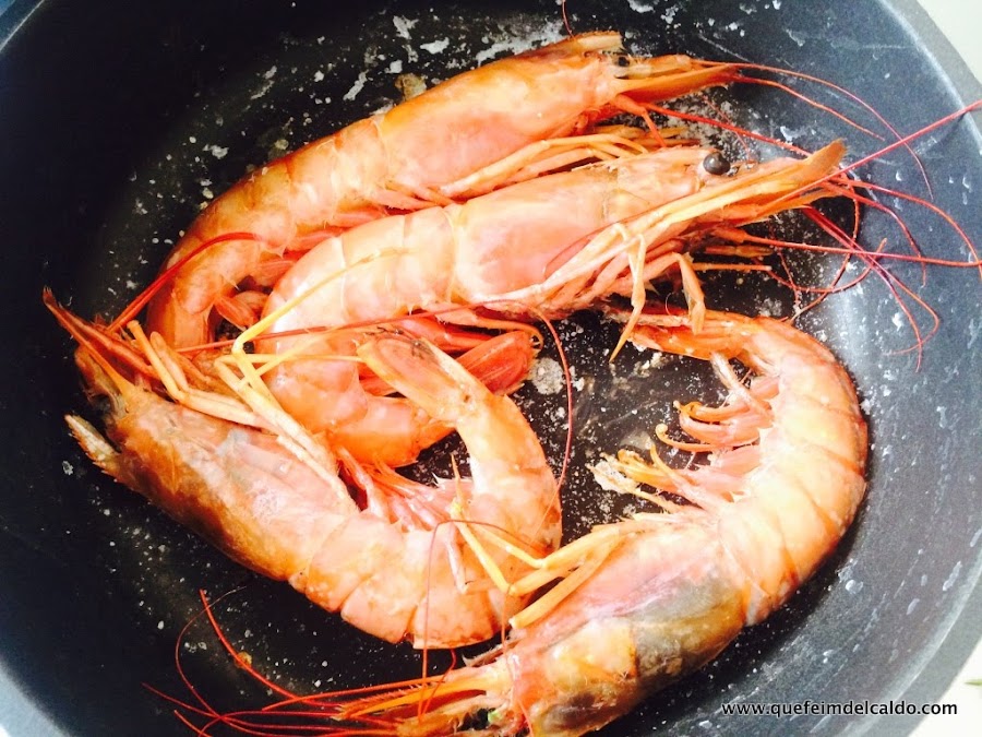 Mientras se cuece el arroz doramos los 4 gamboens en una sartén.