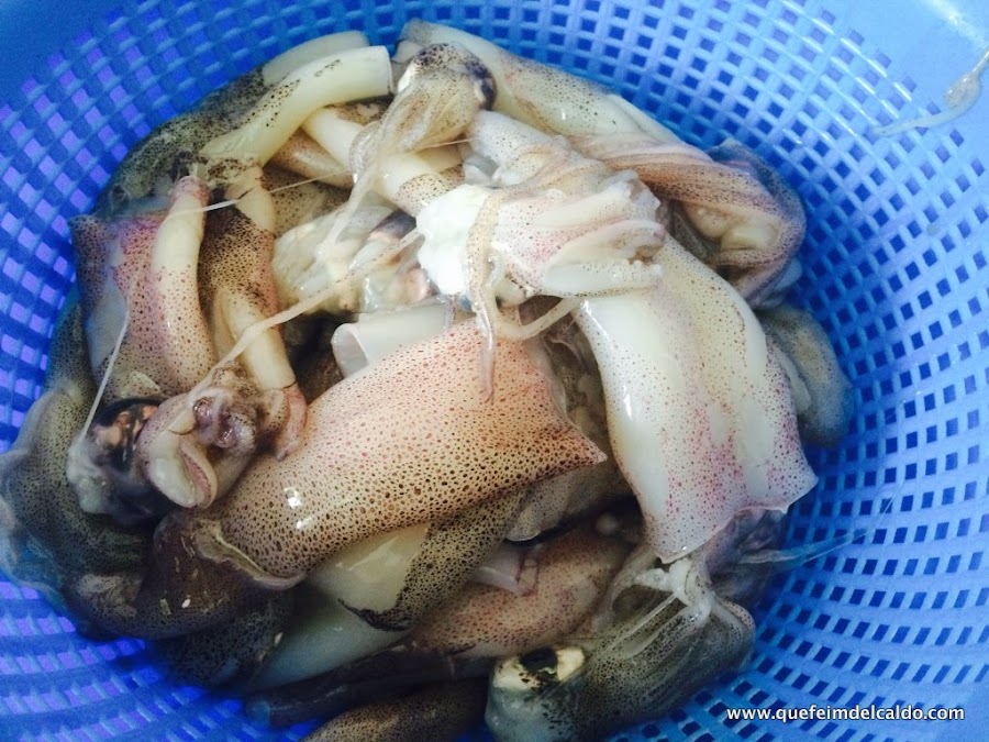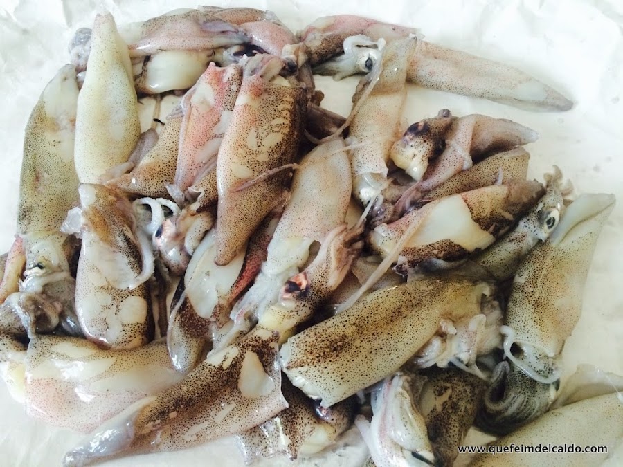 Los limpiamos de la siguiente manera, separamos los tentáculos del cuerpo, cortamos los tentáculos y tiramos la boca, sacamos la espina central del calamar, los lavamos en agua y dejamos escurrir.