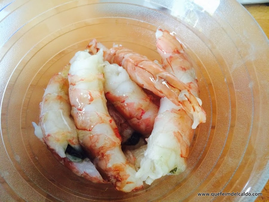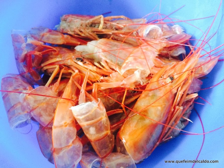 En total tenemos alrededor de 15 gambones, pelamos todos los gambones excepto 4. NO TIRAMOS LAS CASCARAS NI LA CABEZ