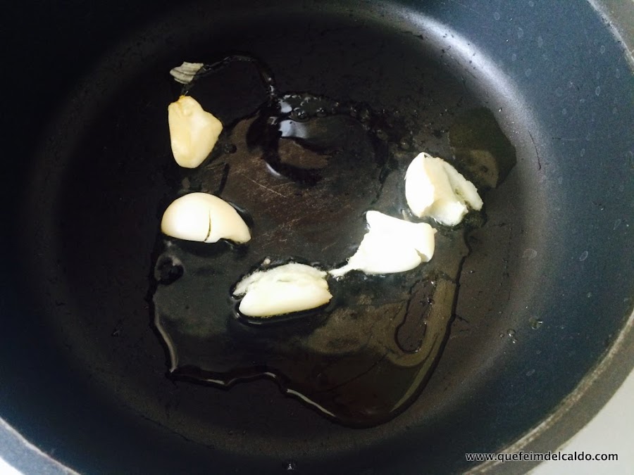 Mientras tanto hacemos la picada, para ello doramos los 5 dientes de ajo que hemos machacado y pelado.