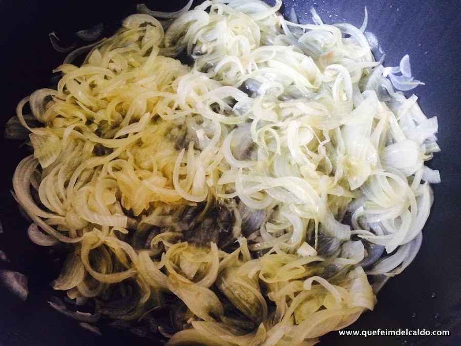 Para mí este paso es fundamental para hacer un buen guiso y un buen plato, ya lo he dicho varias veces, para mí el secreto de la cocina está en el tiempo del sofrito de la cebolla, cuando una cebolla se sofríe bien ya tenemos más del 75% del éxito garantizado, para ello hemos cortado en juliana las dos cebollas grandes, ponemos en la cazuela donde cocinaremos el arroz, incorporamos 4 cucharadas soperas de aceite de oliva y dejamos caramelizando la cebolla durante bastante tiempo, yo la he puesto 1 hora y media a una potencia del fuego de 3-9. Sé que es mucho tiempo, pero probarlo y ya veréis el resultado.