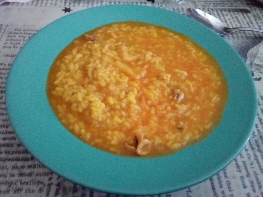 Incorporamos el caldo y el bacalao, cocemos el conjunto durante 20 minutos. Echamos el colorante y rectificamos de sal.