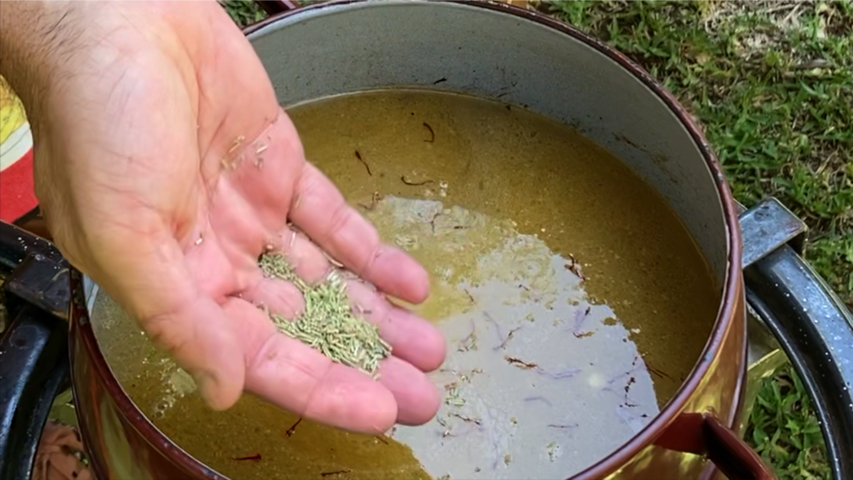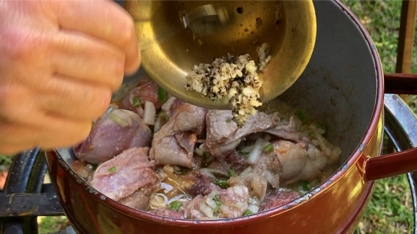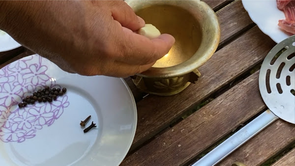 Pon en el mortero un ajo pelado, el clavo y la pimienta. Machácalo todo hasta conseguir una pasta.