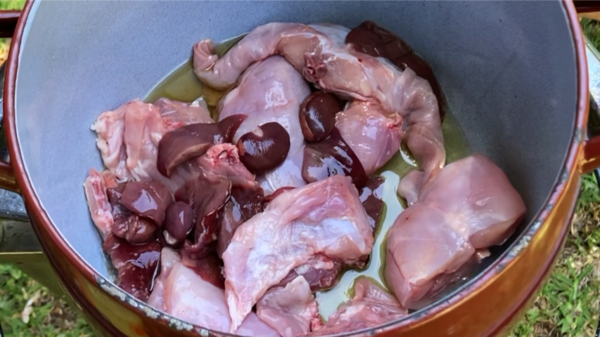 Limpia y trocea el conejo. Retira la grasa de los riñones. Lipia y trocea el hígado.
