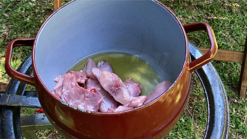 Pon una olla a fuego medio-alto con el aceite de oliva e introduce el conejo.