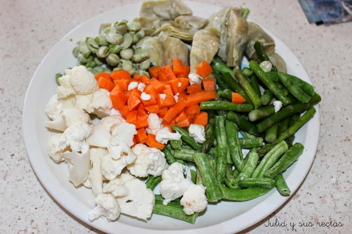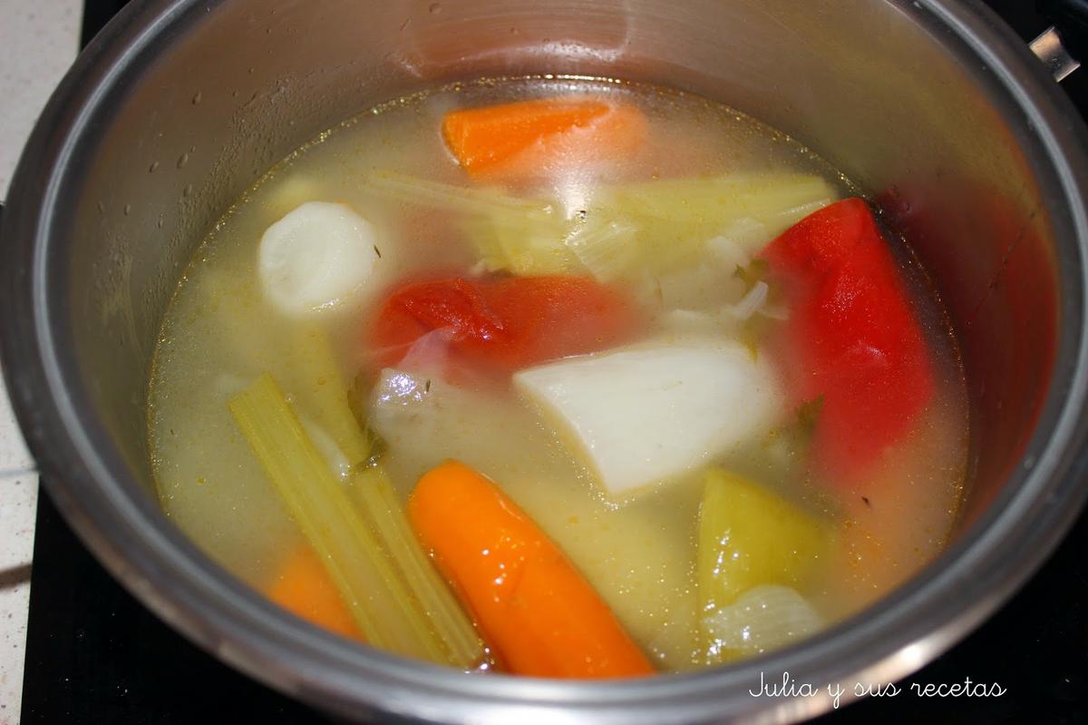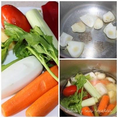 - sal al gustoPrimero hacemos el caldo de verdura. En la olla exprés ponemos la cucharada de aceite y sofreímos la cebolla en trozos grandes, añadimos el resto de las verduras troceadas grande, la rehogamos un poquito y las cubrimos con agua y una poquita sal .