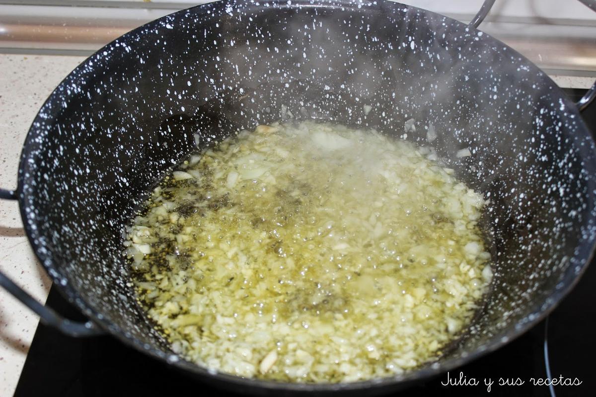 En una cazuela ponemos un poquito aceite y sofreímos el ajo y la cebolla picaditos.