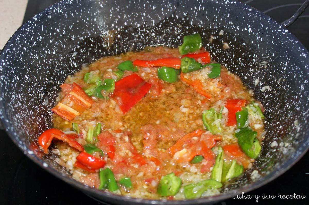 Añadimos el pimiento y el tomate picados y los rehogamos bien.