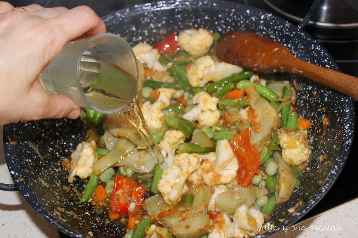 Por último añadimos las verduras troceadas. Las rehogamos y les añadimos el vino.