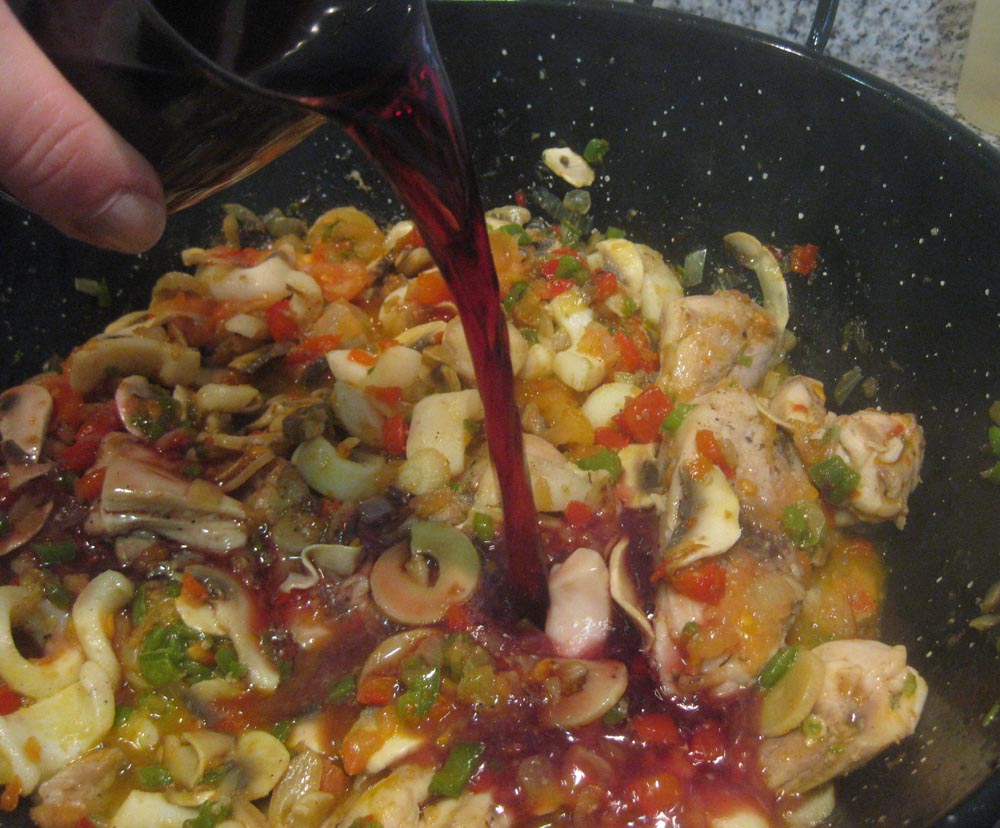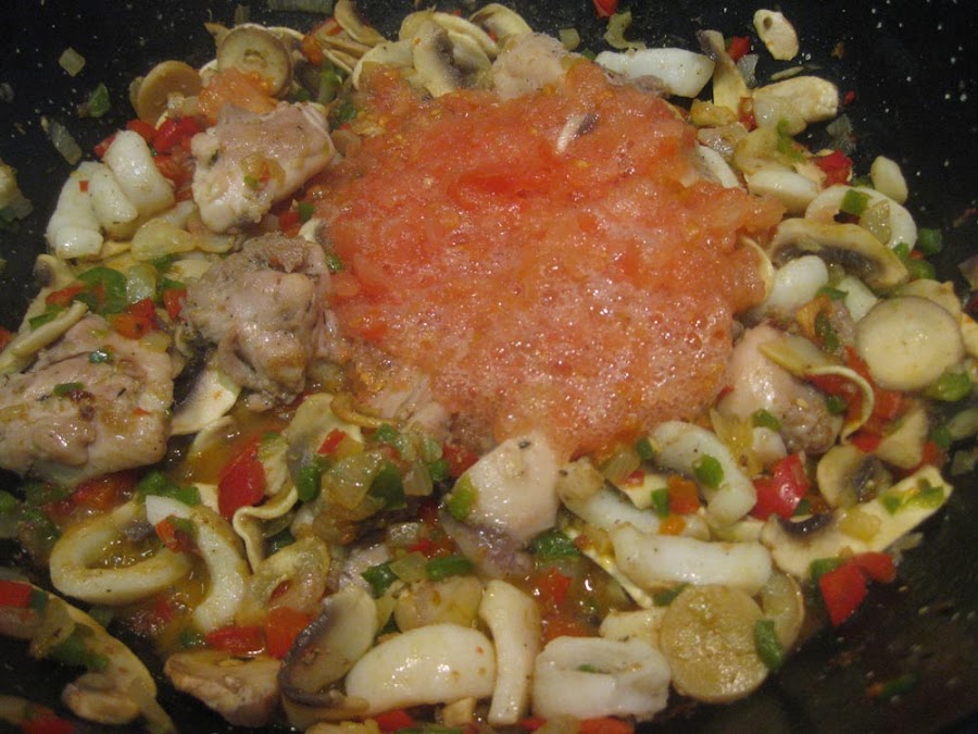 A continuación añadimos la carne, los calamares, los ajos y el tomate (yo lo pongo rayado). Mareamos unos minutillos y añadimos el vino y cubrimos con agua. Dejar hervir como unos 15 - 20 minutos, hasta que reduzca el caldo, para que la carne y los calamares queden después blanditos.