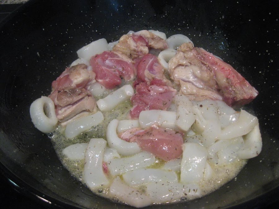 En el mismo aceite doramos las anillas de calamar y el pollo bien limpio de piel, deshuesado y troceado los cuales condimentaremos con sal, pimienta y tomillo. Una vez doradito apartamos y reservamos.