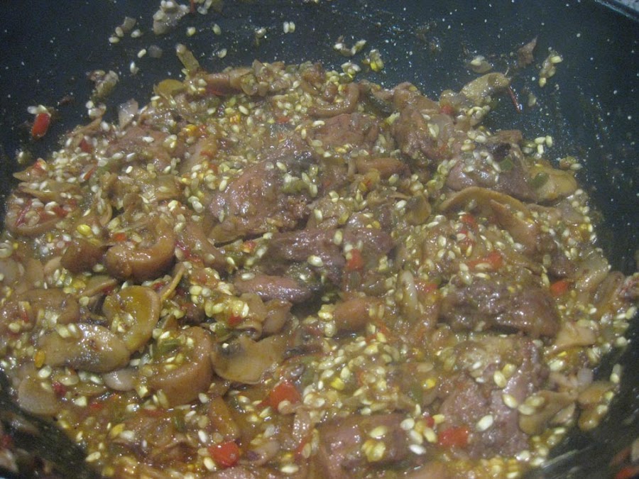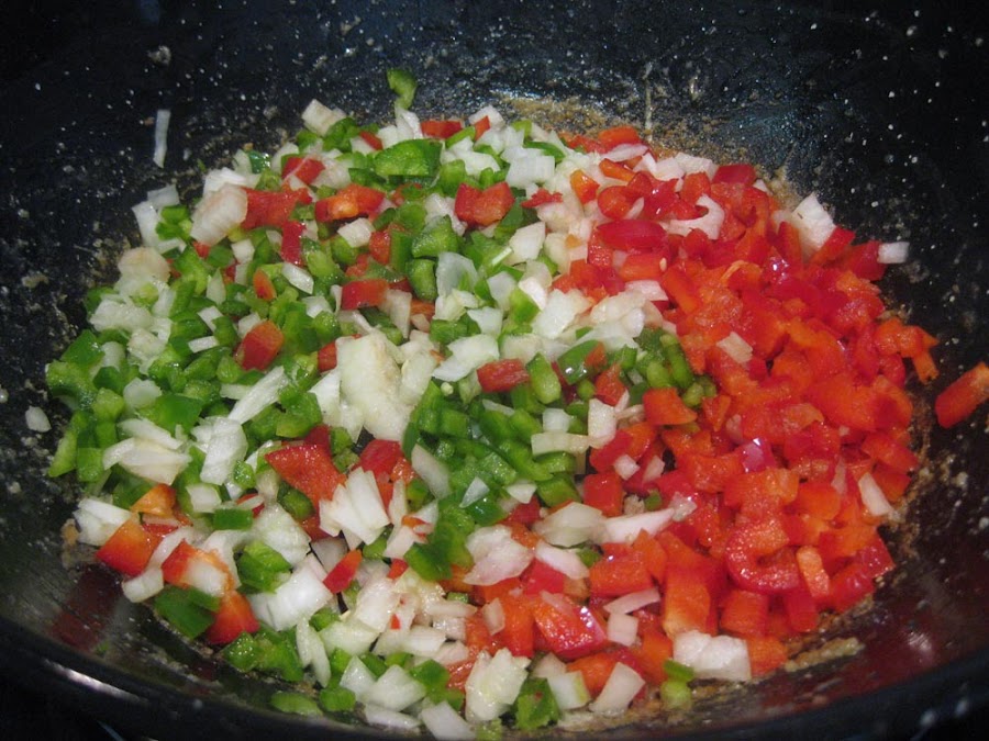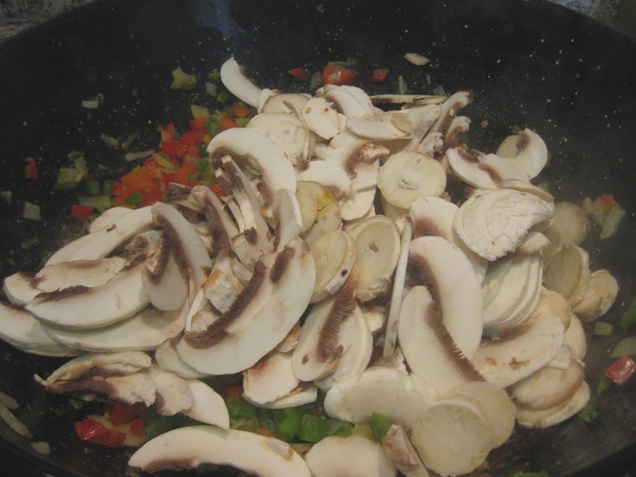 En el mismo aceite pochamos la cebolla y los pimientos, todo bien picadito, cuando esté a medio hacer le añadimos los champis laminados, troceados o como más os gusten.