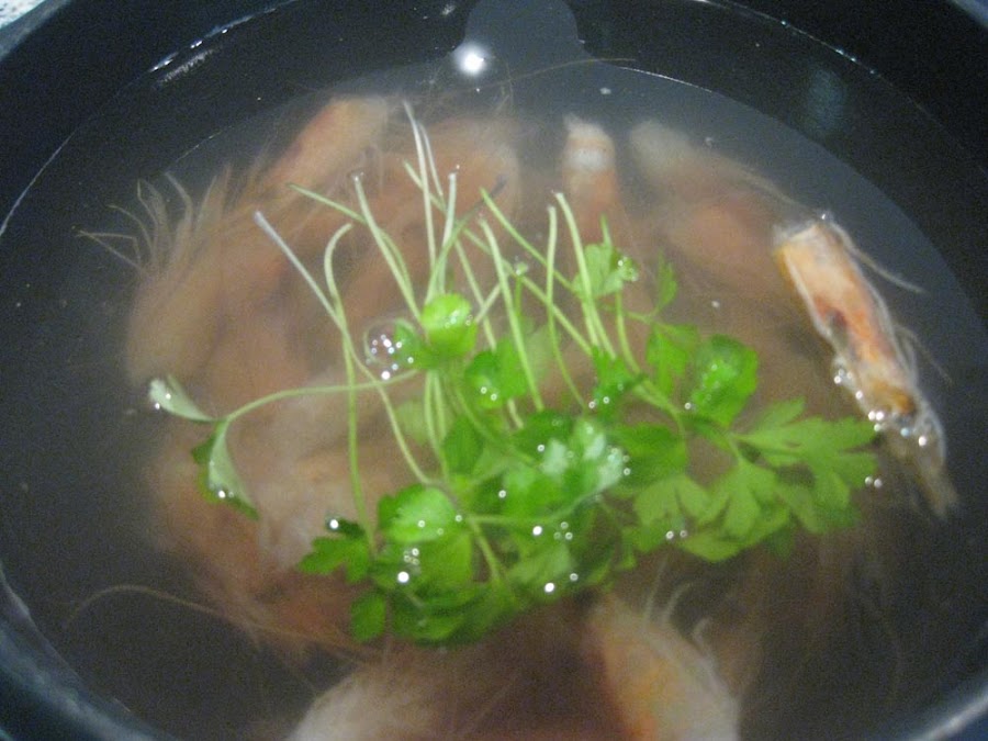 Mientras ponemos en un cazo las cabezas de las gambas, un poquito de perejil y agua a cocer para hacer el fumet. Con que hierva unos 10 minutillos será suficiente. Reservamos las gambas.