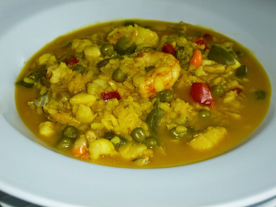 Revolver de vez en cuando y cocinar a fuego medio durante 20 minutos revolviendo. A los diez minutos de cocción añadir los trozos de bacalao, las zamburiñas, los guisantes y la sal.