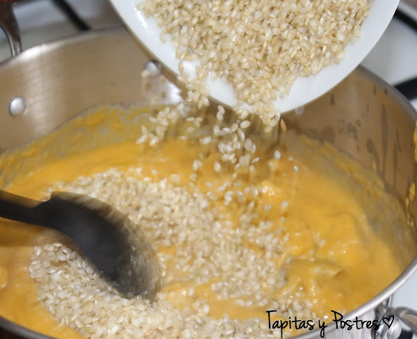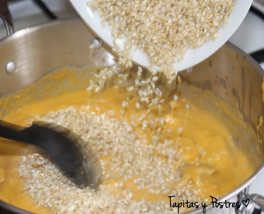 Lavamos bien el arroz y lo agregamos a la cazuela para que tome sabor. Yo he usado arroz integral.