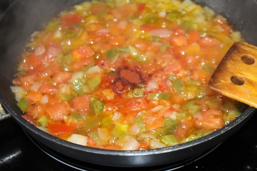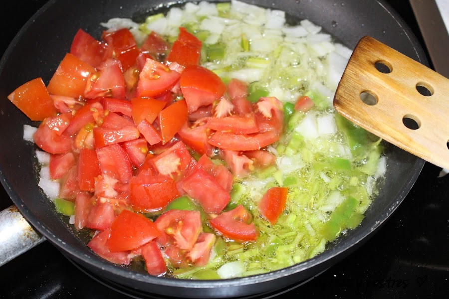 Vamos a preparar el sofrito poniendo el aceite en una sartén y pochando la cebolla y el pimiento que habremos picado pequeñito. Cuando la cebolla esté transparente añadimos el tomate y lo sofreímos unos minutos. Añadimos el pimentón y damos unas vueltas. Trituramos el sofrito con la batidora y reservamos.