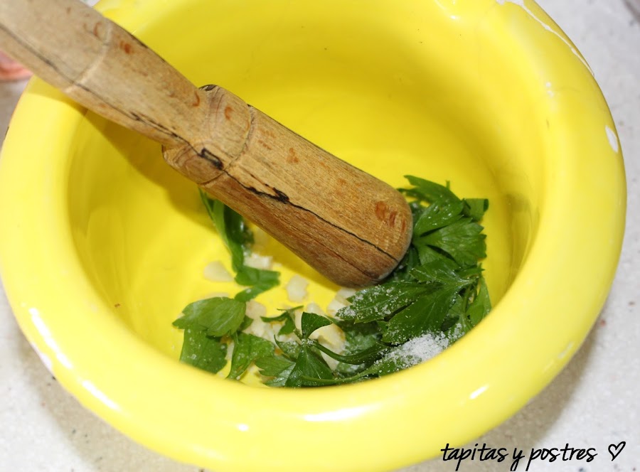 Dos dientes de ajo y unas hojas de perejil majados en un mortero