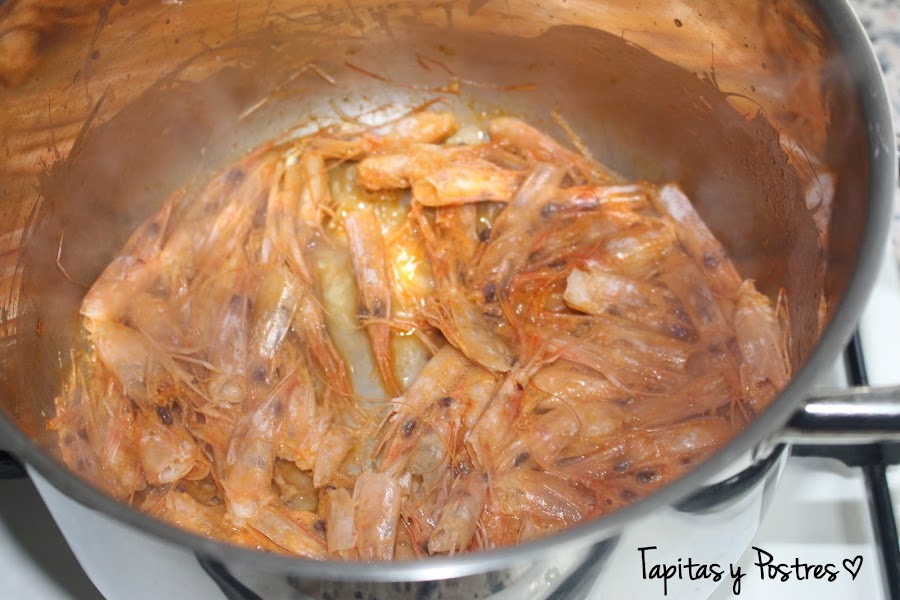 Ahora vamos a hacer el fumet. En la olla ponemos a freir en un poco de aceite las cabezas de las gambas y vamos machacando con una cuchara de palo para que suelten jugo.
