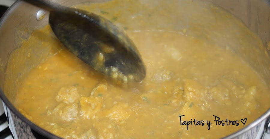 En otra sartén vamos a dorar el pollo que habremos salpimentado y espolvoreado de comino. Cuando esté doradito lo colocamos en una olla con el sofrito triturado.