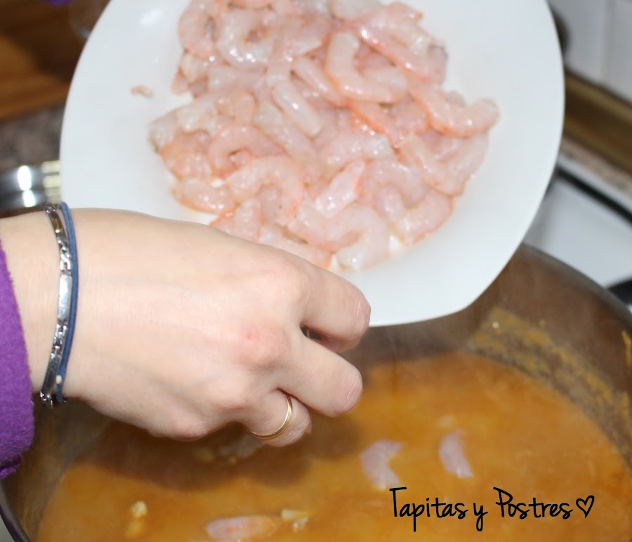 Y mientras dejamos que el arroz repose añadimos las gambas que se harán con el calor residual.
