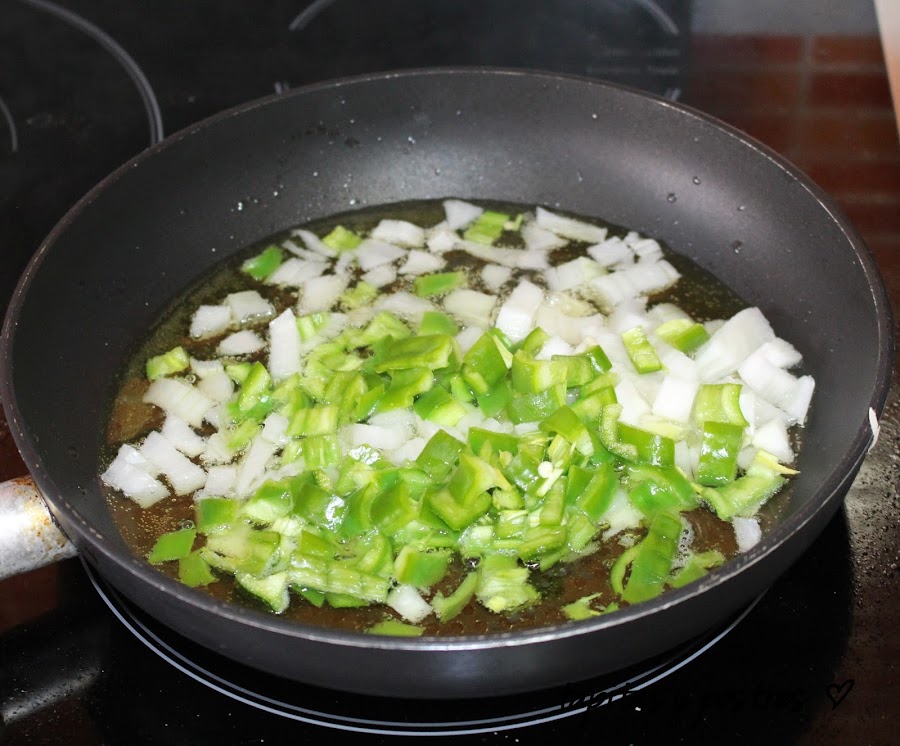 Preparamos el sofrito: pimientos y cebolla a pochar.