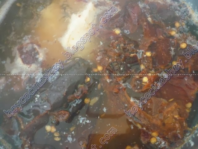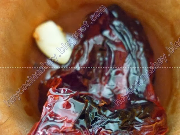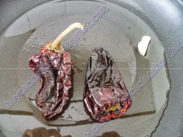 Ponemos el diente de ajo y los pimientos choriceros, doramos: