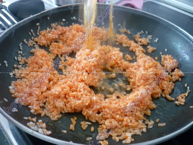 Damos un par de vueltas para que sazone bien el arroz y añadimos el caldo reservado: