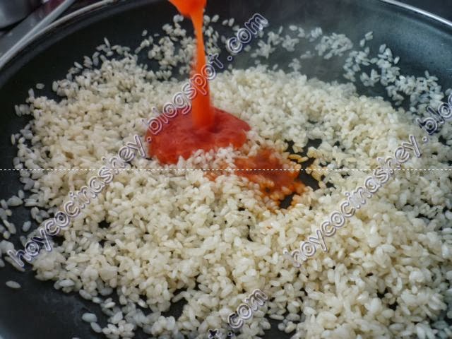 Después de un par de vueltas añadimos, el tomate triturado y el pimentón picante:
