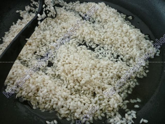 Ahora en la misma cazuela que doramos los pimientos la volvemos a poner al fuego con un chorro de aceite y añadimos el arroz a que dore un poco: