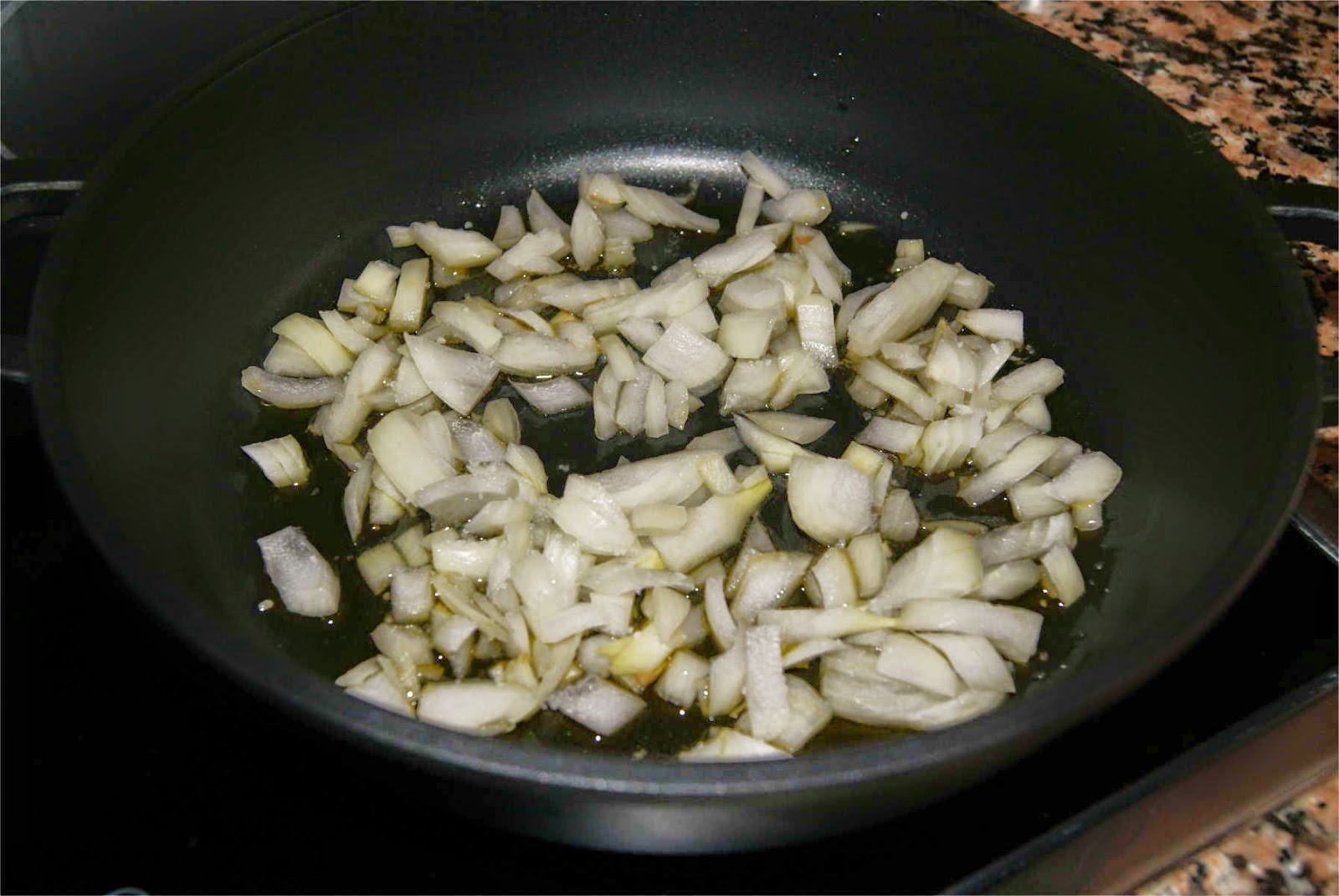 Escurrimos y enfriamos bajo el chorro de agua. Reservamos y ponemos a calentar una tartera con un poco de aceite. Doramos la cebolla cortada no demasiado fina y con un poco de sal.