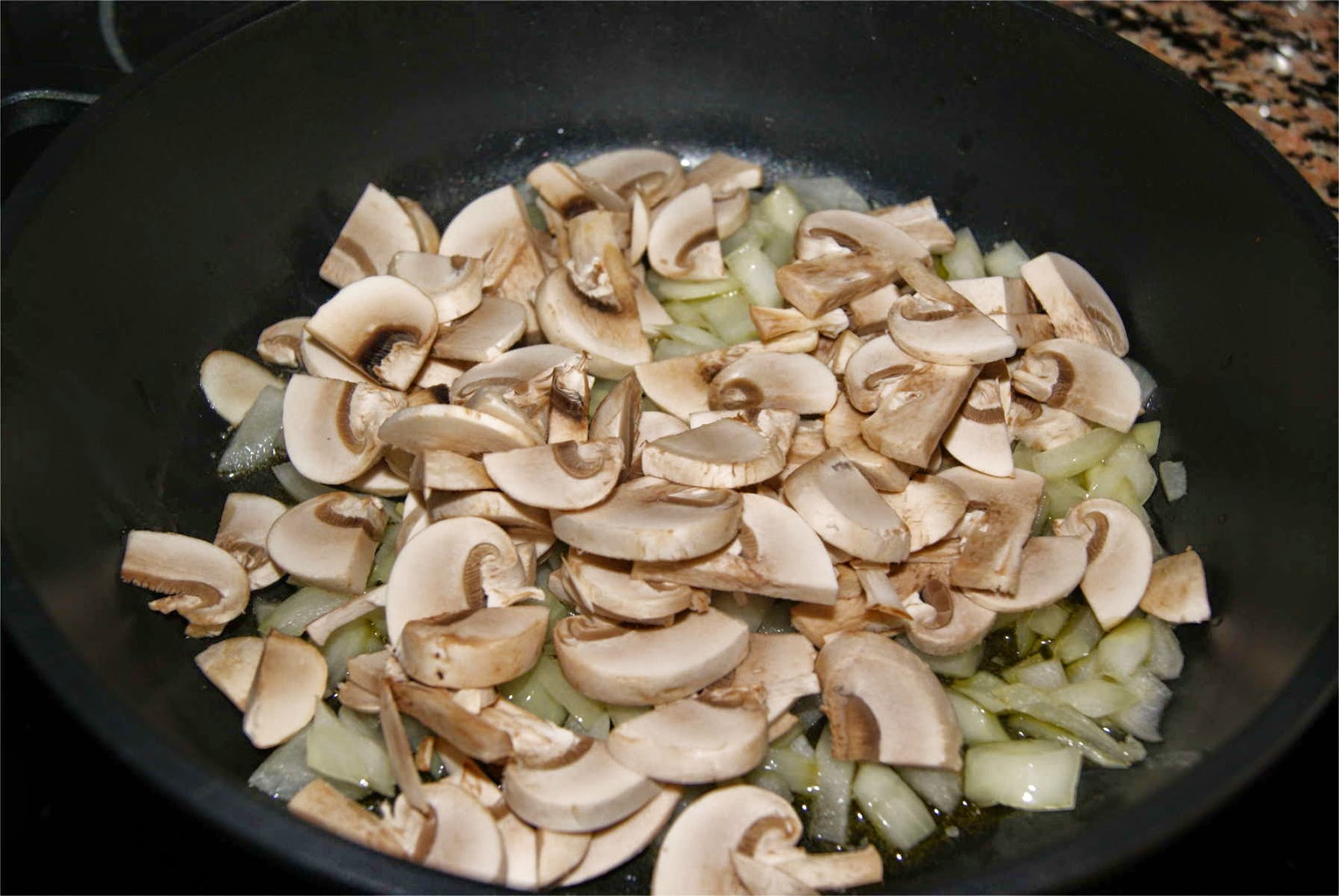 Cortamos los champiñones por la mitad y los fileteamos. Los añadimos cuando la cebolla empiece a coger color y lo rehogamos 5 minutos.